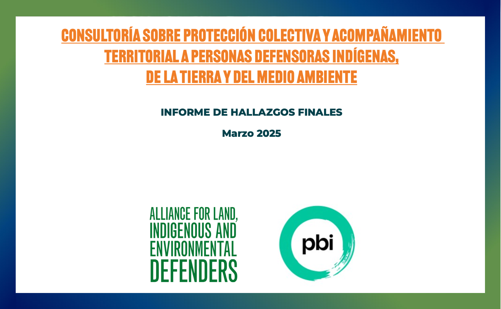 CONSULTANCY ON COLLECTIVE PROTECTION AND TERRITORIAL SUPPORT FOR INDIGENOUS, LAND, AND ENVIRONMENTAL DEFENDERS: FINAL FINDINGS REPORT